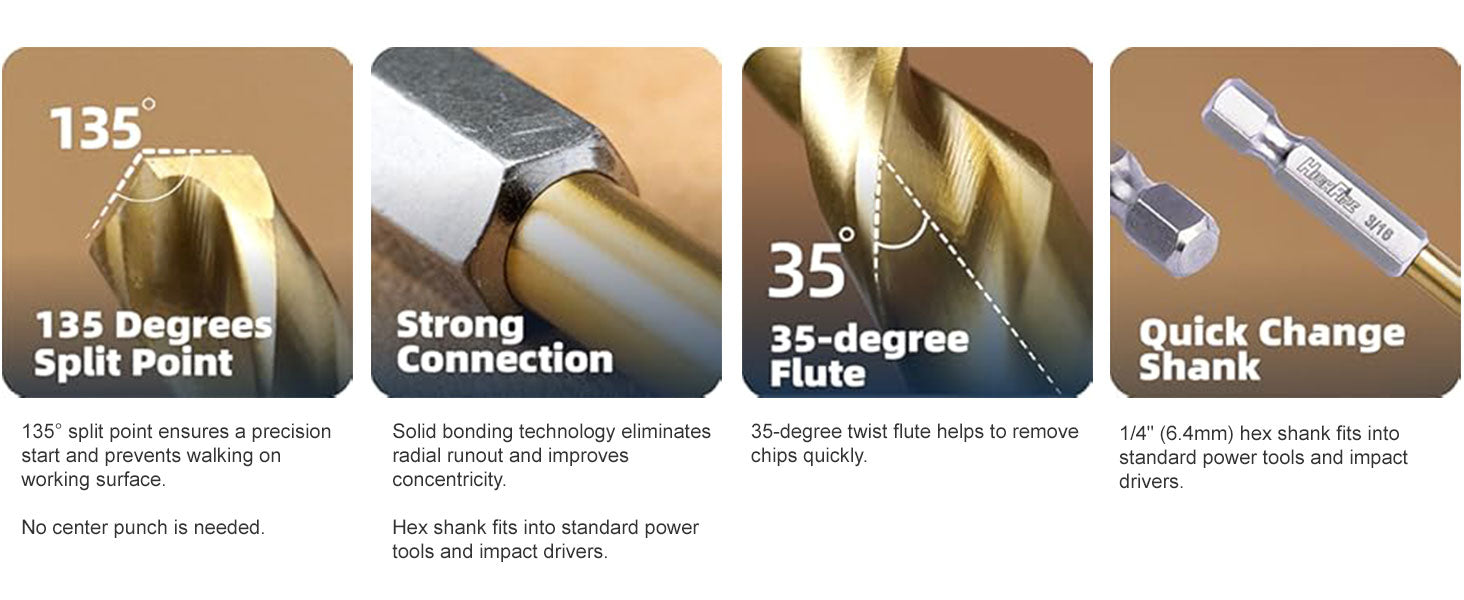 - Sharp Cutting Edge - HIGHFIRE hex shank drill bit set has accurate tip geometry which ensures cutting edge sharp and strong. 135 degrees split point tip provides a no-walking drilling start on working surface.